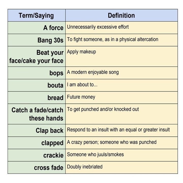 A US high school teacher had the same problem so came up with a slang dictionary to help decipher his students language. Slang Words Teens and Gen Zers Are Using. I am no cap tryna get hip with the slang.