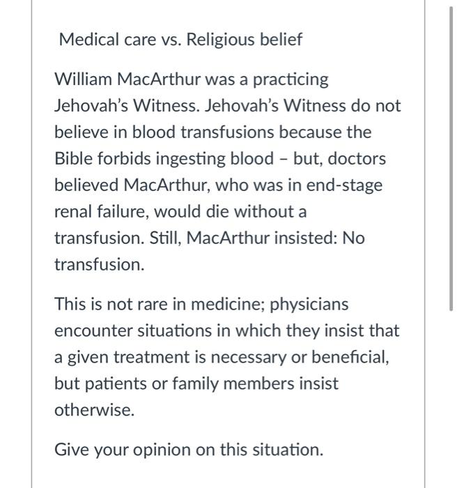 Solved Medical Care Vs Religious Belief William Macarthu Chegg Com